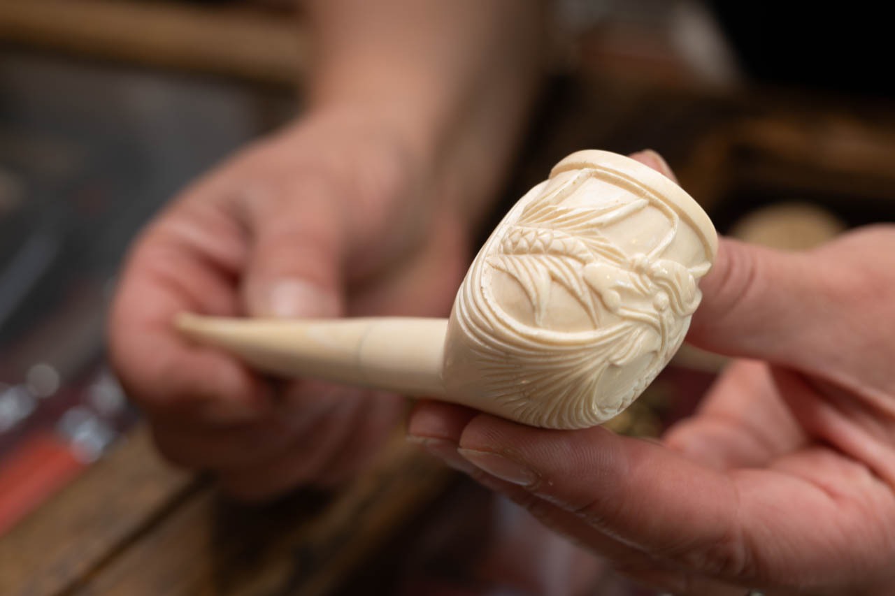 白く滑らかな質感と繊細な彫刻が特徴の海泡石(écume de mer)のパイプ。トルコ産の天然鉱物から彫り出されるこの素材は、吸い込んだ煙の色で徐々に飴色に変化していく特性があり、喫煙とともに育てる愉しみがある。