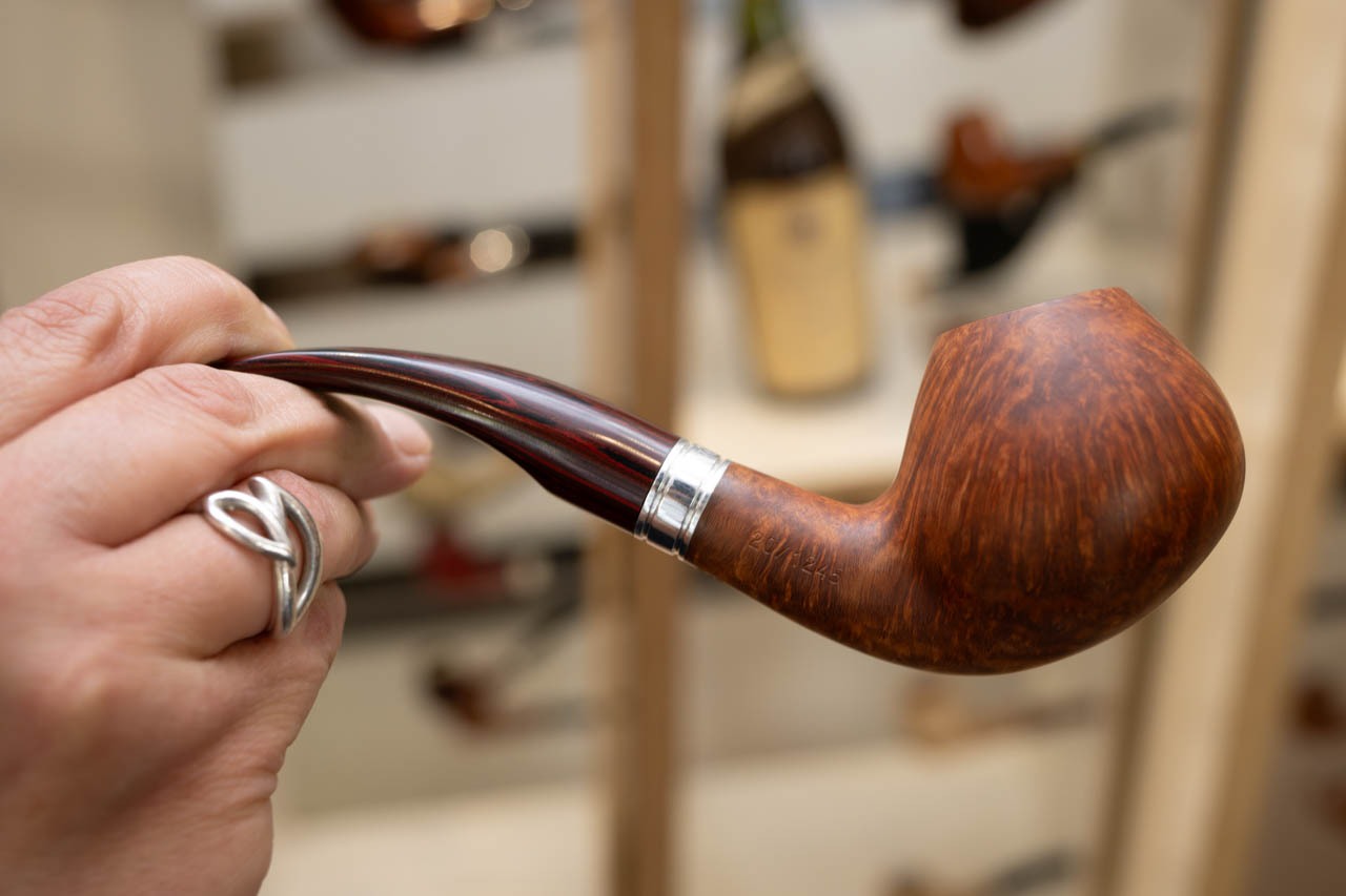 ここで扱われるパイプは、すべてが職人による一点物。フランスの名工Pierre Morel(MOF=フランス最優秀職人章受章)をはじめとする新世代の“pipier”たちの手によって作られる。伝統的には地中海沿岸の樹齢数百年のブリヤール(ヒース)が用いられるが、質の良い素材が減少する中、オリーブやレモンウッド、野生チェリーなど、さまざまな代替材が試みられている。