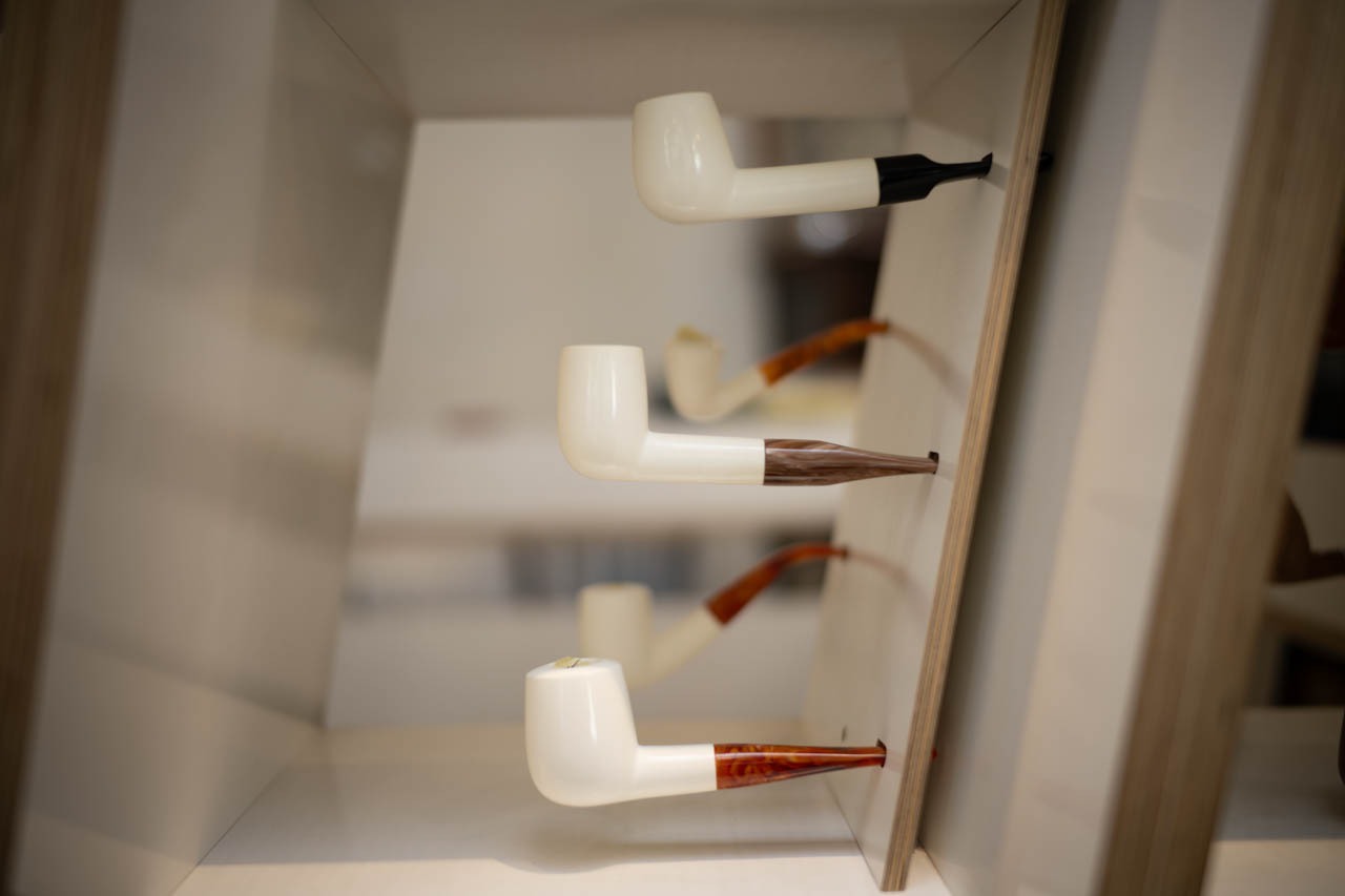 棚に整然と並ぶ海泡石のパイプ。吸い込む煙とともに白から飴色へと変化し、使う人ごとに異なる風合いを刻んでいく。軽さと滑らかな喫味で、ブリヤールとはまた違った魅力を持つ素材だ。