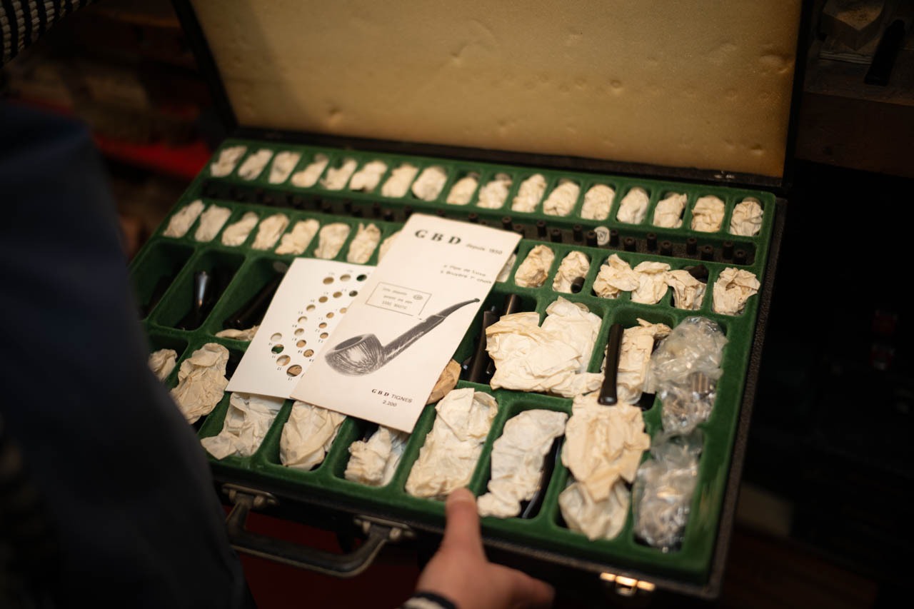 ここで扱われるパイプは、すべてが職人による一点物。フランスの名工Pierre Morel(MOF=フランス最優秀職人章受章)をはじめとする新世代の“pipier”たちの手によって作られる。伝統的には地中海沿岸の樹齢数百年のブリヤール(ヒース)が用いられるが、質の良い素材が減少する中、オリーブやレモンウッド、野生チェリーなど、さまざまな代替材が試みられている。