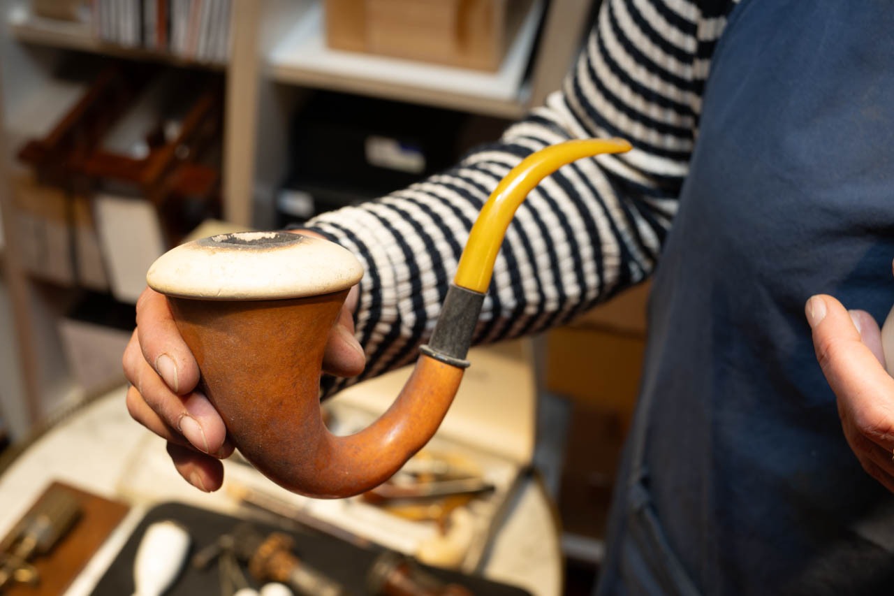 Marie-Aurélieは、パイプの修理・洗浄・吸い口の交換も行う。「壊れたら終わり」ではなく、「壊れても直せる」のがパイプの世界だ。たとえば、1989年製のDunhillや、1960年代の“黄金期”に製造された分解式モデルの修復もこなす。