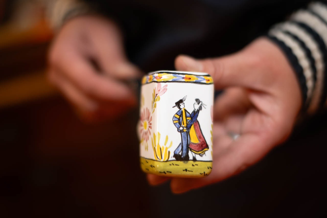 ブルターニュ地方のカンペール焼きで作られた陶器のパイプ。素朴な筆致の人物画と鮮やかな彩色が特徴で、地方の陶芸文化と喫煙文化が結びついた逸品だ。
