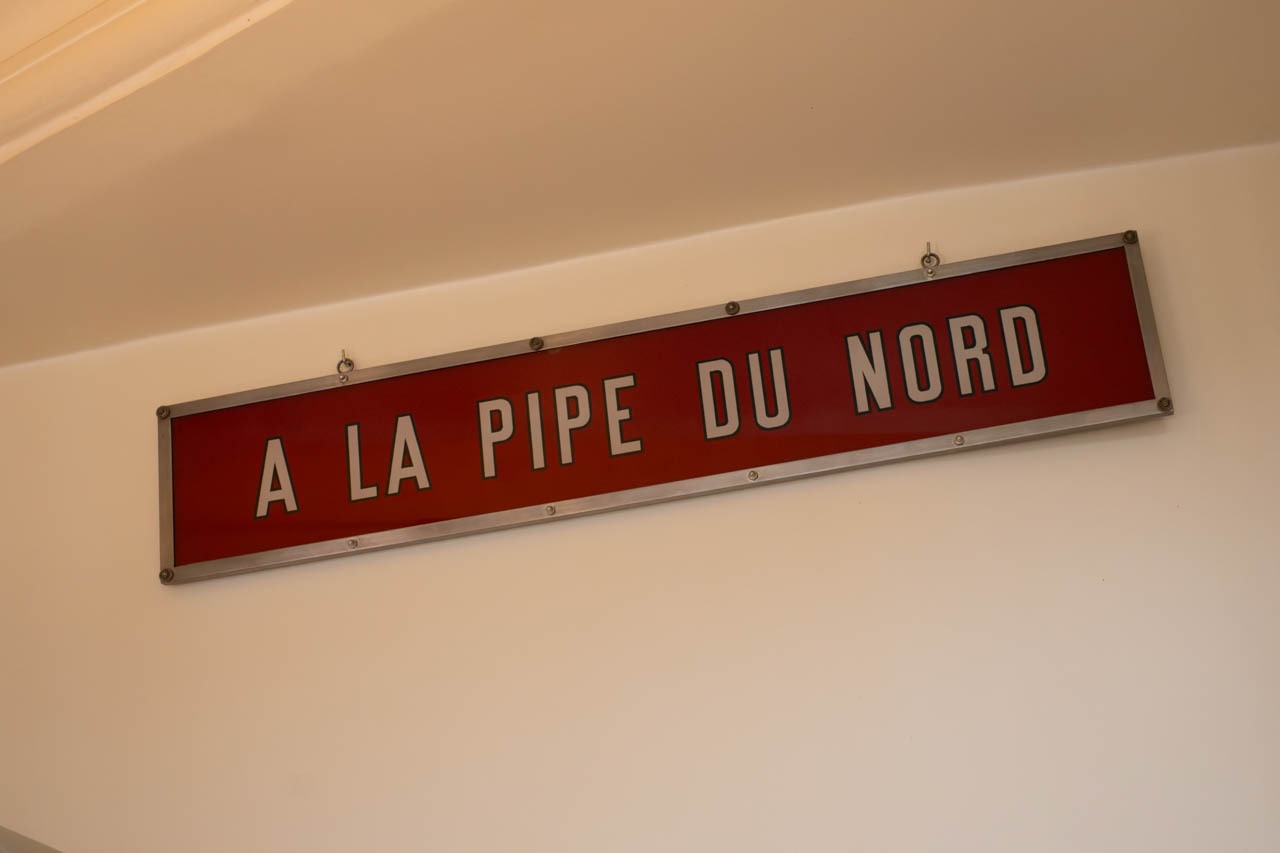 喫煙ルームに掲げられた「A LA PIPE DU NORD」の看板。これは1867年の開業当時から受け継がれてきたもので、店の歴史と記憶を象徴している。