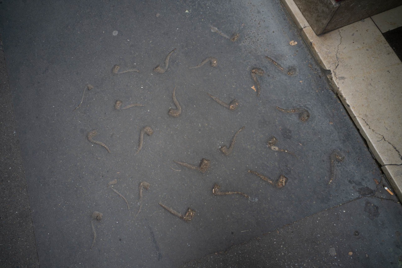 店の入口前の通りに残るパイプの跡。道路工事の際、アスファルトが固まる前に実際のパイプを押し付けて刻んだものだという。老舗らしい遊び心が今も足元に残されている。