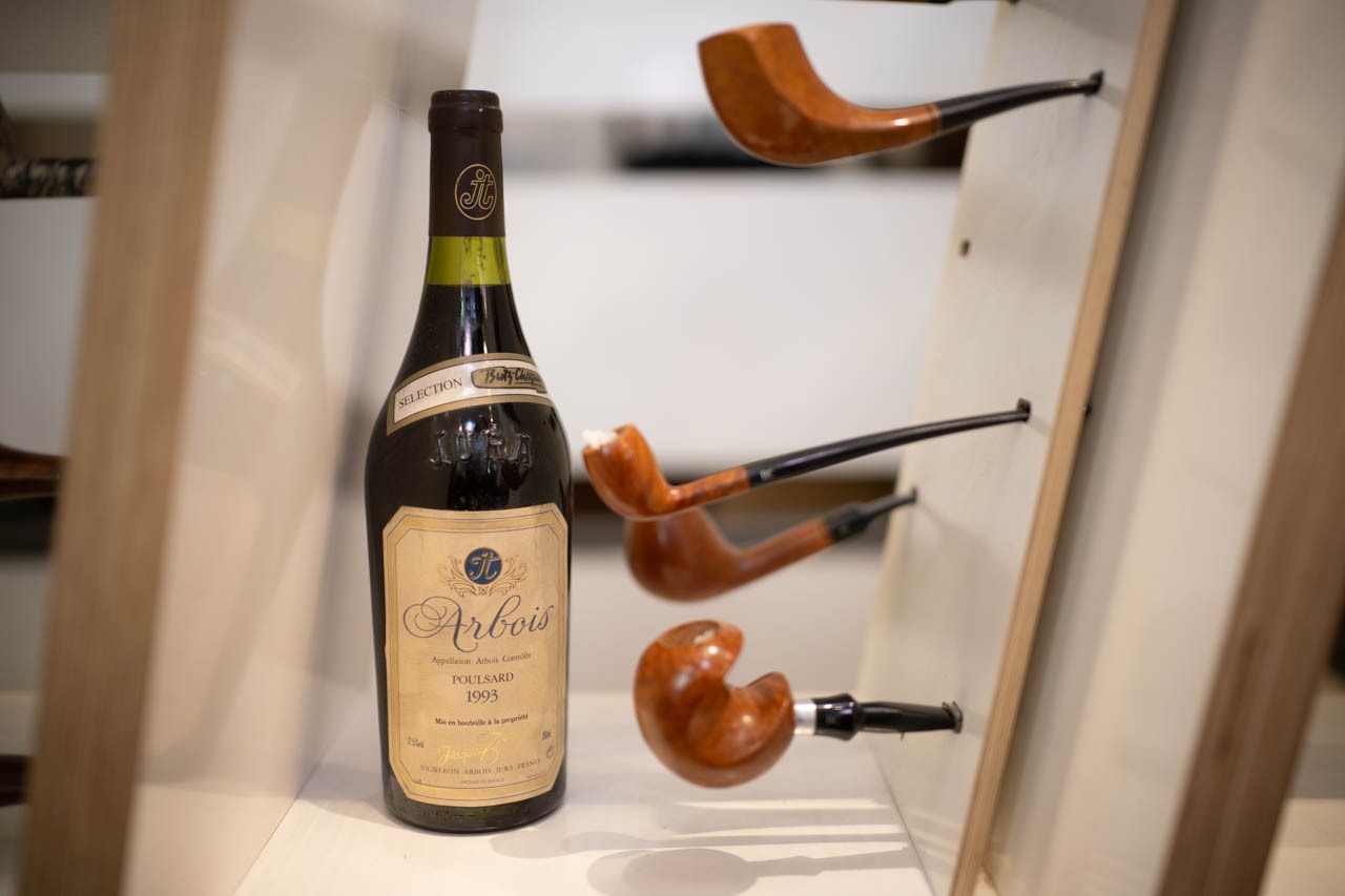 フランスのパイプといえば、ジュラ地方サン=クロード産が知られる。そんな背景を思わせるように、店内にはアルボワのジュラワインがひっそりと飾られている。かつてLa Pipe du Nordでは、アルコール類も取り扱っていたという。