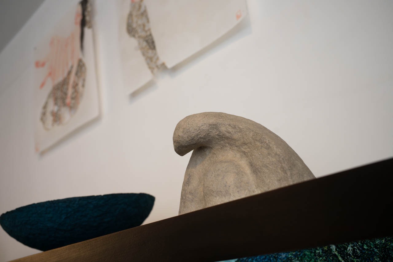 フランスで広く使われている卵パックの紙を素材に作られた鳥の彫刻。再生紙ならではの質感が、素朴で柔らかなフォルムと静かに呼応している。