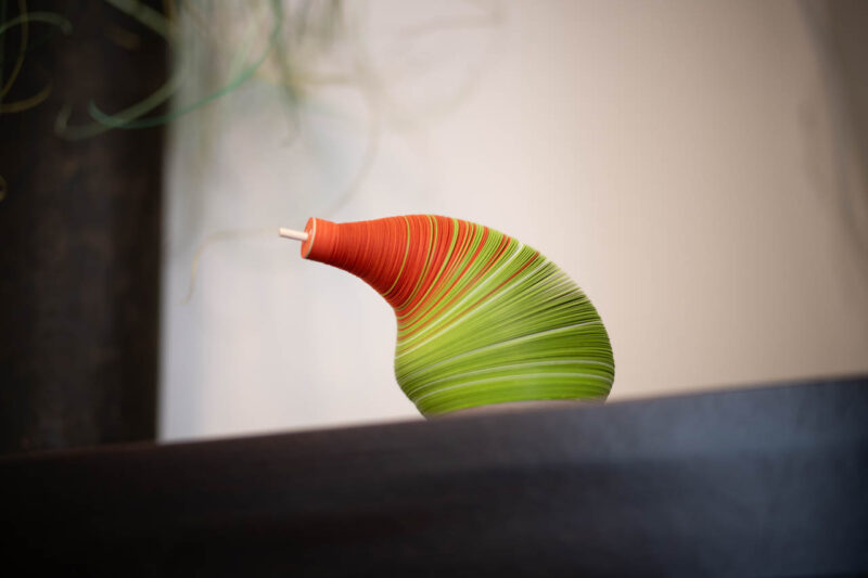 径の異なる丸い紙を一枚ずつ丁寧に重ねて生まれた造形。断面のわずかなずれが色彩の流れをつくり、彫刻でありながらグラフィックのような視覚的リズムを感じさせる。