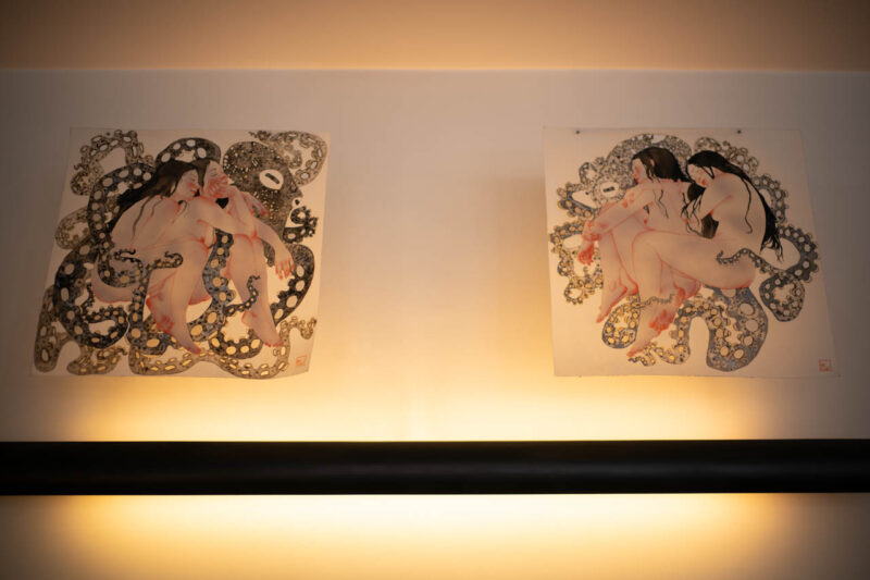 向かい合う女性の身体を絡め取るように描かれた蛸の足。その吸盤の部分には紙が焦がされ、穴が穿たれている。描かれた線と焼かれた痕——紙の持つ柔らかさと脆さが同時に立ち上がる。