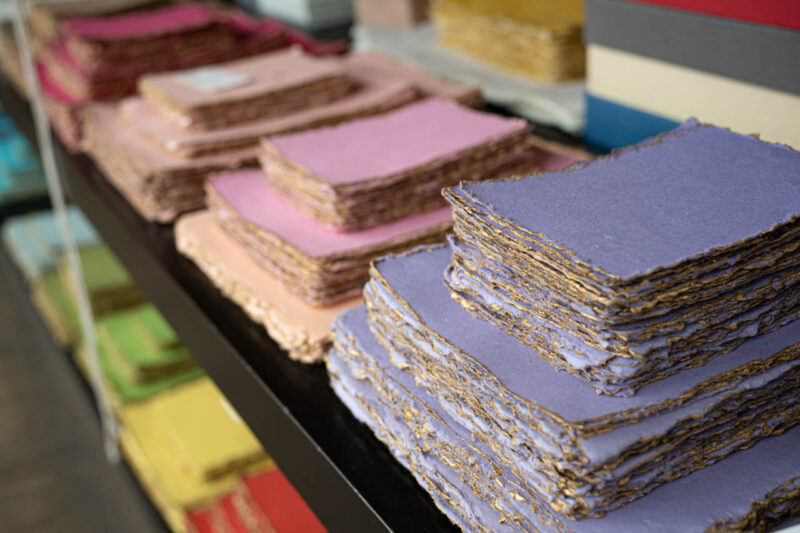 店内に並ぶのは、日本の手漉き和紙、ネパールやメキシコの天然素材紙、そしてアーティストや職人とのコラボレーションで生まれた一点もののノートや小冊子。このアトリエでは、私たちにとって身近な存在である“紙”が、それぞれ一つひとつ異なる表情を持つ「一品もの」として丁寧に扱われている。