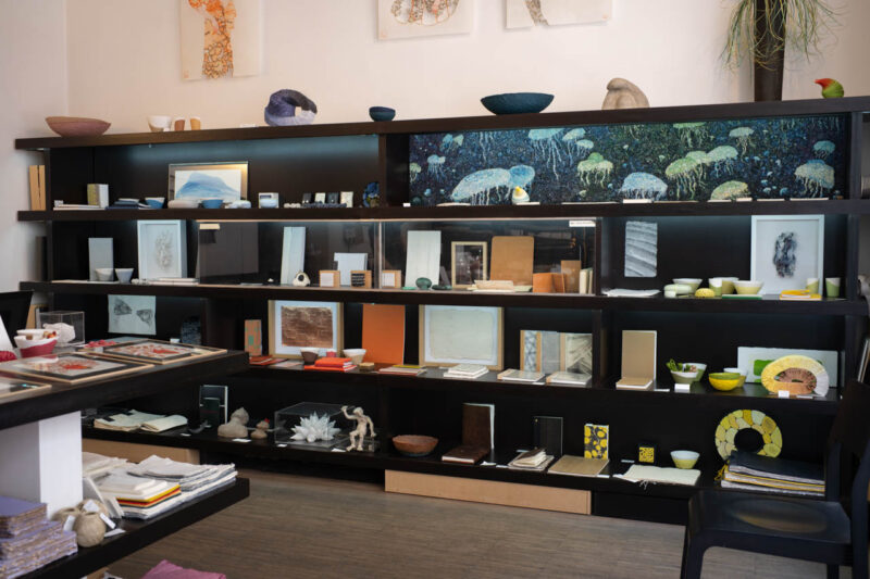 店内に入ると、紙に魅せられた作家たちによる作品や工芸品が整然と並ぶ。それぞれの紙が持つ質感や色、かたちの違いが静かに語りかけるように配置されており、紙という素材への視線の深さと、オーナーの確かな審美眼が感じられる。