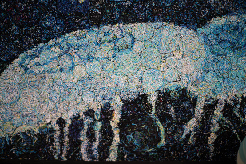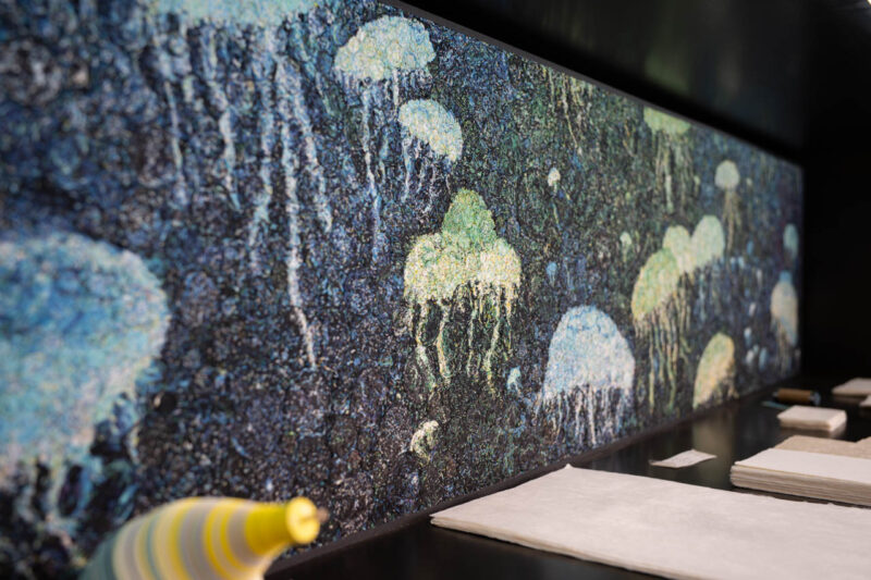 長さ約3センチ、幅わずか2ミリほどの細長い紙片を一本ずつ束ね、面を構成していくという気の遠くなるような技法による作品。点描にも似た視覚効果は、すべて紙という素材の密度と反復によって生まれている。