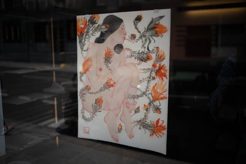 ウィンドウには週替わりで作品が展示される。この日は、紙を焦がす技法で知られるアーティスト Mme S による作品。繊細さと力強さが同居するその世界観が、道行く人の足をふと止めさせる。