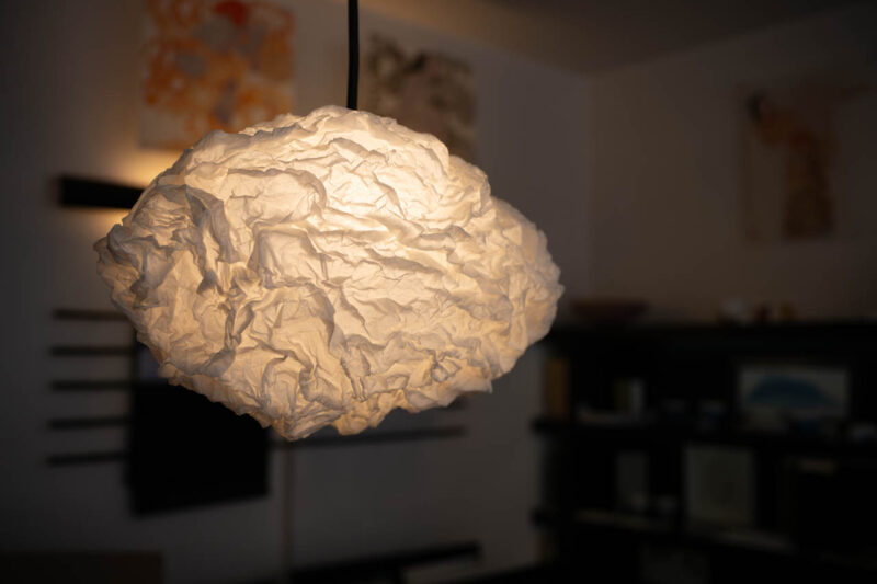 くしゃくしゃにされた紙の質感をそのまま生かした照明。素材はあくまで紙だが、灯りを通すことでその繊維や陰影までもが立ち上がり、空間に柔らかな存在感を与えている。