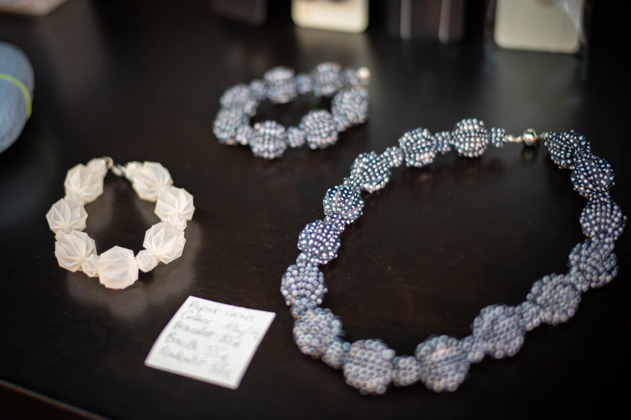 一見するとビーズや陶のようにも見えるが、すべて紙で作られたジュエリー。折る、丸める、貼り合わせる——軽やかでいて精緻な手仕事が、紙という素材にまったく新しい表情を与えている。