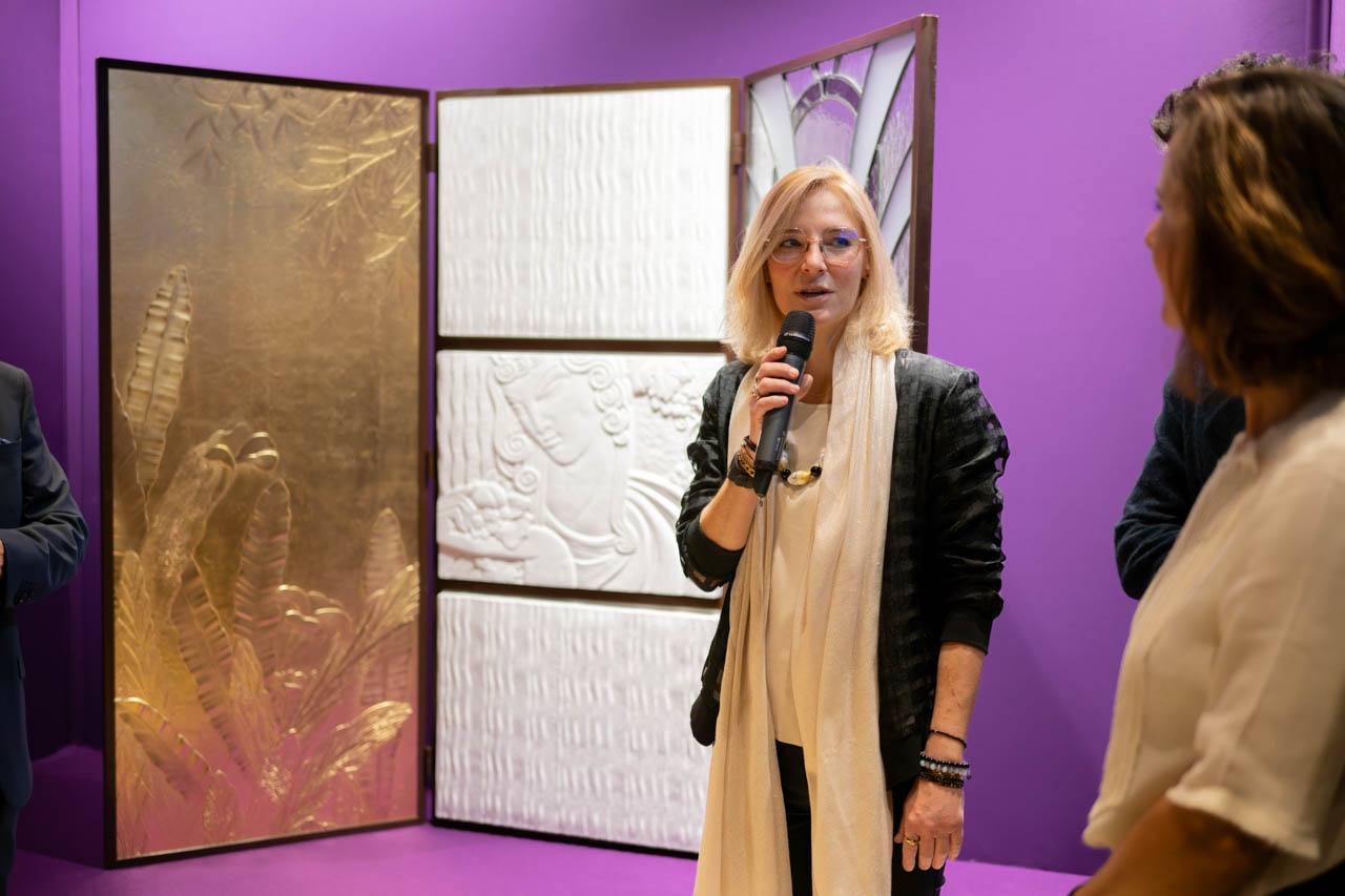 サロン入口に設けられたアール・デコ100周年記念の共同制作パネル。Atelier Camuset、Féau Boiseries、La Maison du Vitrail の三工房が手掛け、漆喰、木、ガラスという異素材の対話で1925年様式の精神を現代に甦らせた。オープニングでは制作者たちが制作への思いを語り、写真はステンドグラスを担当したエマニュエル・アンドリュー。