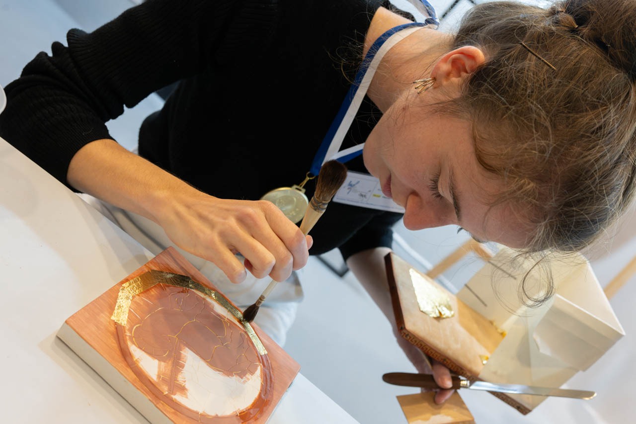 ガブリエル・ブーリエ(Gabrielle Bourrier)。金箔押し(dorure à la feuille)の MAF=フランス最優秀見習い 受賞者。ボーロ(赤土)で整えた下地に箔を運び、筆で密着させて継ぎ目をなじませる工程を実演。