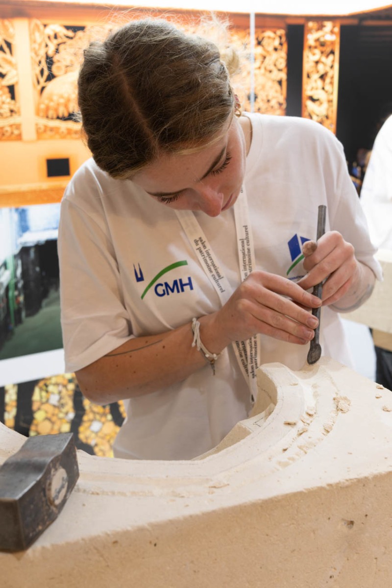 教会や城など歴史建築を支える石工(tailleur de pierre)の実演。テンプレートに合わせて石灰岩を刻み、丸ノミやグラディーヌでモールディングを立ち上げる。GMH(歴史的記念物修復企業グループ)ブースで若手職人が基本手順を披露。