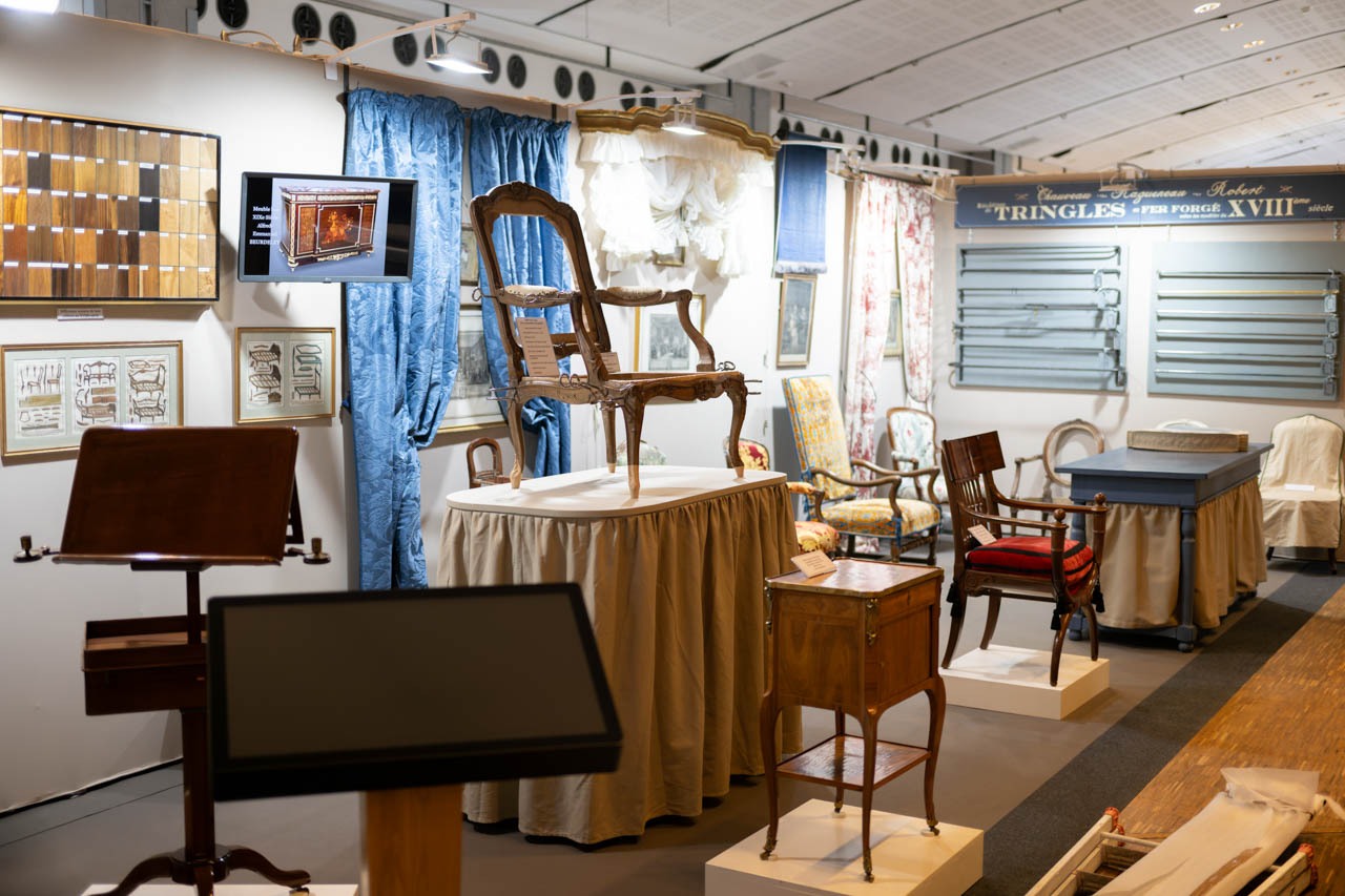椅子張りと木工(tapissier d’ameublement/ébénisterie)の修復ブース。18世紀様式の椅子骨格を中心に、仕上げ見本板、張り地、室内装飾用トリングル(鉄製カーテンポール)の復元部材までを並べ、家具とインテリアを横断する工程を体系的に可視化している。