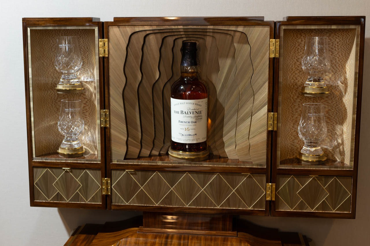 Atelier Marcu(アトリエ・マルク)のエベニスト作品。修復で培った木口合わせと突板細工を生かし、段階的に切り抜いた突板リリーフで中央に光を集めるニッチを形成。両袖にはクリスタル用の真鍮台座、下段には幾何学象嵌の扉を配し、ウィスキーと葉巻を愉しむための小型キャビネットとして仕立てている。