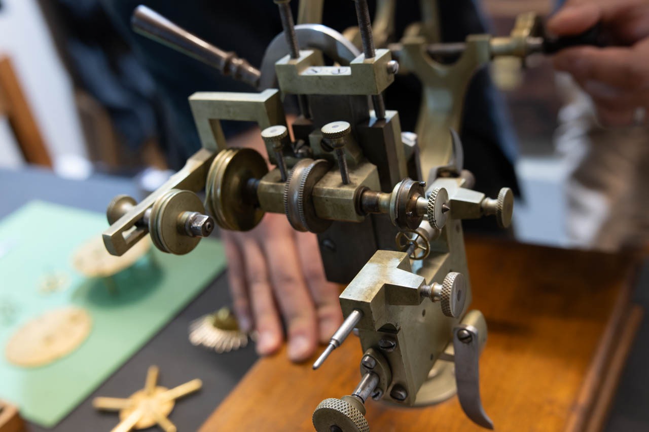 欠損歯車は当時と同じ材・工法で新作。写真は歯車切り盤(wheel cutting engine)による製作工程で、割出台とカッターを同期させて一歯ずつ切り上げる。機械も往年の逸品を用い、歴史時計の機構精度と時代性を両立させる。