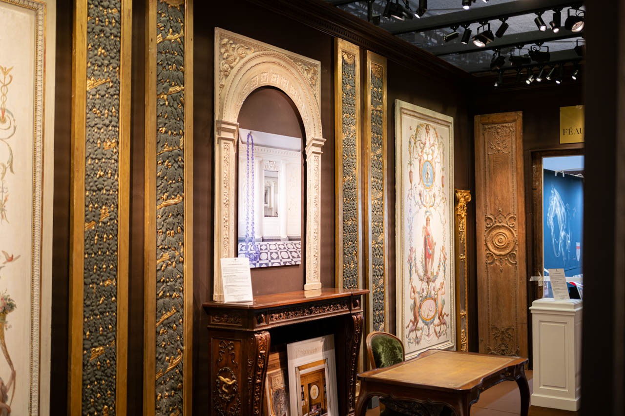Féau Boiseries のブース。18~20世紀のオリジナル資料に基づく木彫パネルとスタッコを、古色仕上げと金箔で再現。トリュモー、グロテスク文様、ネオクラシックのアーチまで室内建築の“骨格”を実寸で示し、歴史的内装の保存・復元から現代邸宅の特注制作まで一貫して手掛ける。
