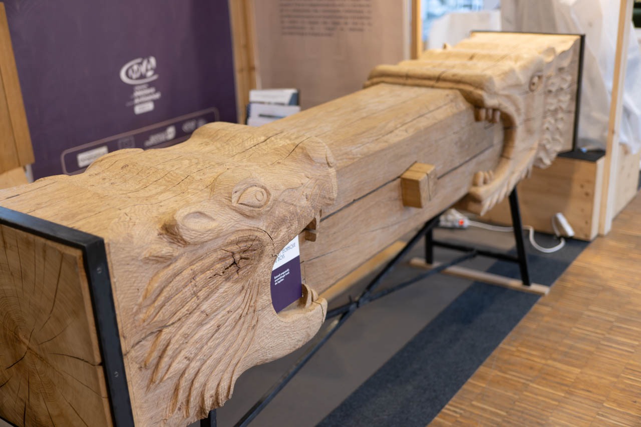 「Entrait engueulé, assemblage trait de Jupiter(口を開いた梁端・ジュピター仕口)」と記された展示。古典木構造の継手を実寸で示した技術教育用モデルで、梁端を怪物頭(engoulant)の彫刻で飾りながら、力学的に精緻な“ジュピター接合”を再現。伝統的木組みの構造美と象徴性を一体として伝える。