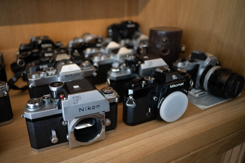 ショーケースのひとつには、日本人にとってもなじみ深い機械式一眼レフの名機たちが並ぶ。Nikon F、Nikomat、そして往年のNikkorレンズ群。それぞれに使い込まれた痕跡がありながらも、どのカメラも今すぐにでもシャッターを切れそうな佇まいを見せている。