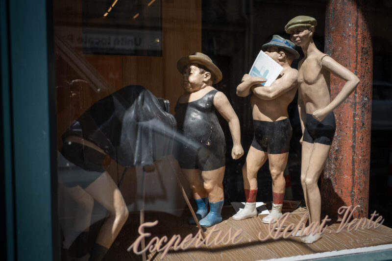 同じ通りの向かい側には、海水浴を楽しむ三人組が記念撮影に臨む姿をかたどったユーモラスなフィギュアが飾られている。黒布をかぶった古典的なカメラマンとともに、この飾りは店のトレードマークとして通りを行き交う人々の目を引いている。