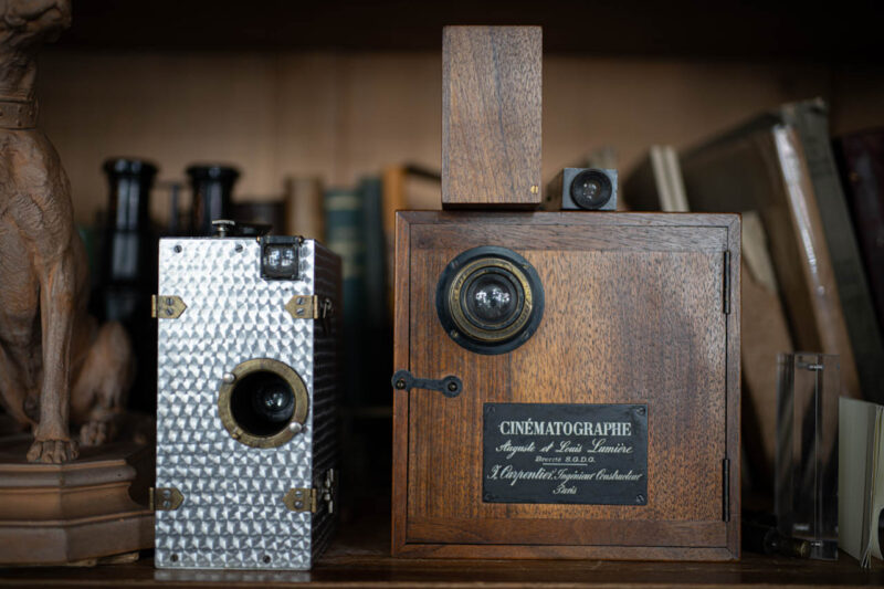 中央は、リュミエール兄弟の名が刻まれた「シネマトグラフ」。撮影・映写・現像の3役をこなす19世紀末の画期的な装置で、映画誕生の象徴ともいえる存在。左の銀色のボディは、戦間期に登場した初期のアマチュア向けシネカメラで、映像表現が家庭に浸透し始めた時代を物語っている。