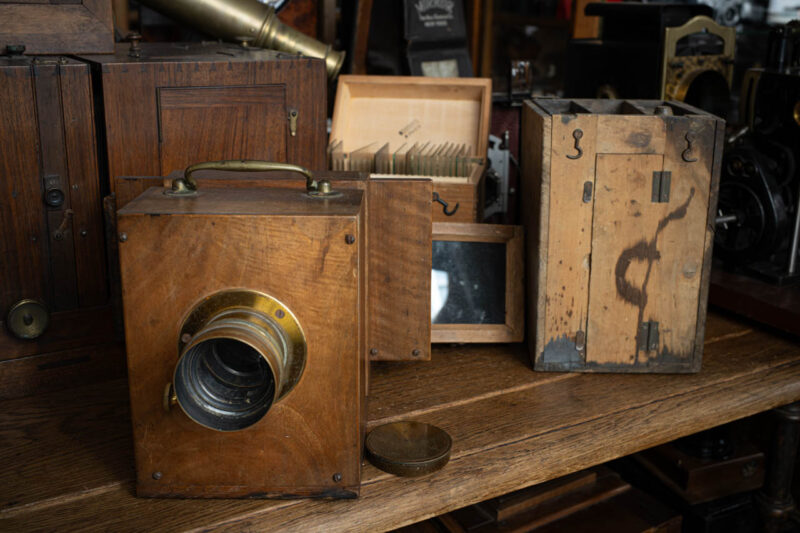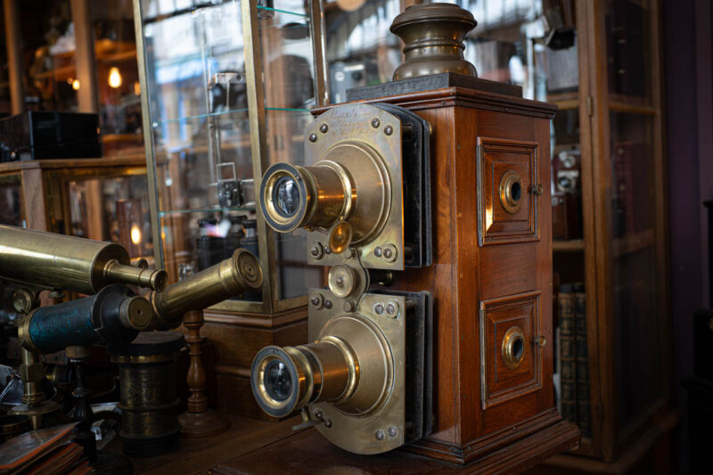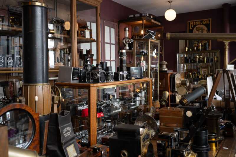 店内風景。まるで19世紀に迷い込んだかのような空間。大型の暗箱カメラ、真鍮製の望遠鏡、重厚なレンズやヴィンテージカメラが所狭しと並ぶ。博物館でも見かけないような希少な機材が、まるで静かに語りかけてくるかのように陳列されている。