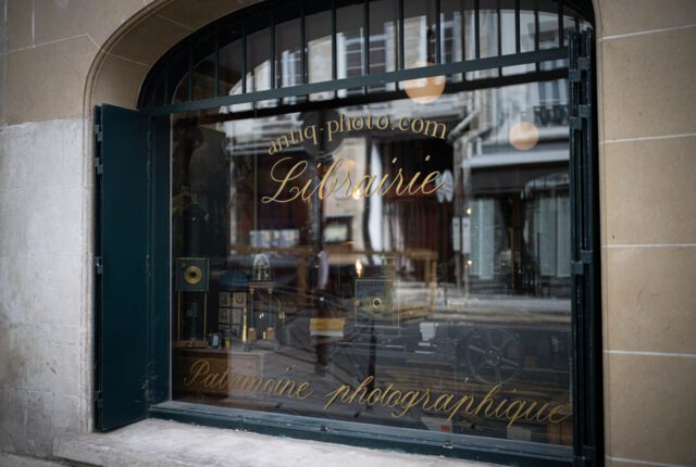 ショーウィンドウに金文字で描かれた「Librairie(書籍店)」「Patrimoine photographique(写真遺産)」の文字が、この店の姿勢を静かに語る。アンティーク・フォトは、単なる中古カメラ店ではない。ここは、写真という文化の記憶を守り、未来へと手渡すための小さな記念館でもある。