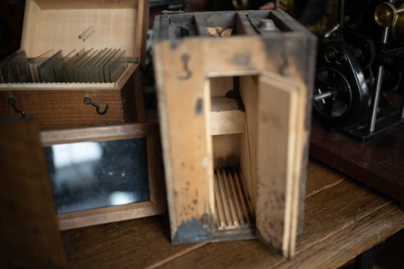 現像用ボックスの扉を開けると、内部には湿板写真に使うガラス板を乾燥・保管できるスロットが備わっている。木箱に残る黒い染みが、コロジオン溶液を扱っていた痕跡を静かに物語る。
