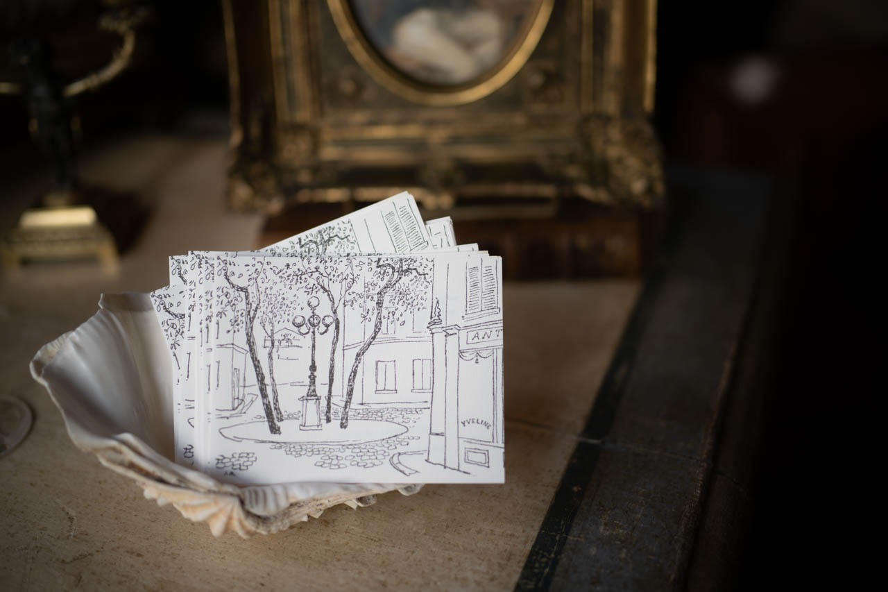 Yveline Antiquesのショップカードに描かれているのは、創業者イヴリンの時代に誰かが描いたブティック前の小広場のスケッチ。今と変わらぬようでいて、街灯のデザインがほんの少しだけ時の流れを語っている。