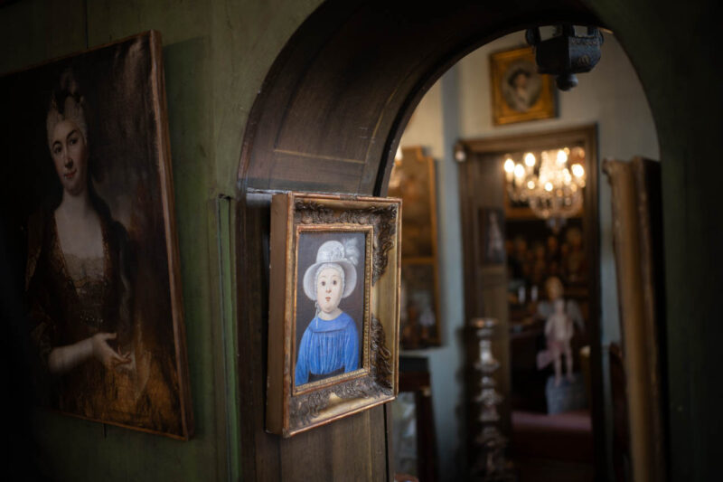 19世紀、青いローブと羽飾りの帽子を纏った幼子の肖像(油彩・33×24cm)。部屋と部屋をつなぐアーチの壁に、まるで時の門番のように佇んでいた。