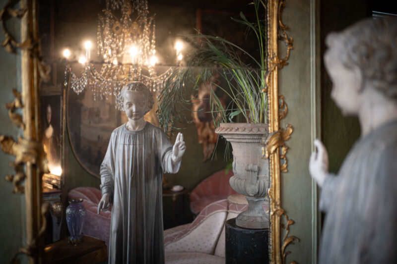18世紀の水銀鏡をはめ込んだ金彩木彫のトゥルモーと、祝福の手を差し伸べる19世紀のEnfant Jésus。ルネサンスへの憧憬と信仰の静けさが、時代を越えて共鳴する。