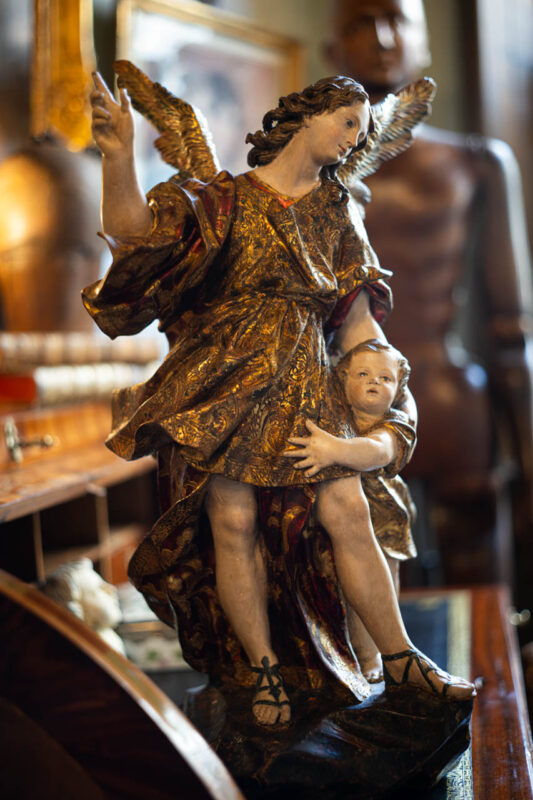 《守護天使と子ども》、ポリクローム木彫、18世紀。この作品はアガタさんの個人お気に入りの逸品。表情豊かな子どもの視線と、天を示すような天使の構図が、祈りと保護の象徴である「守護」というテーマを温かく、親密に伝えてくれる。金彩の衣装には時代の様式美が宿る。
