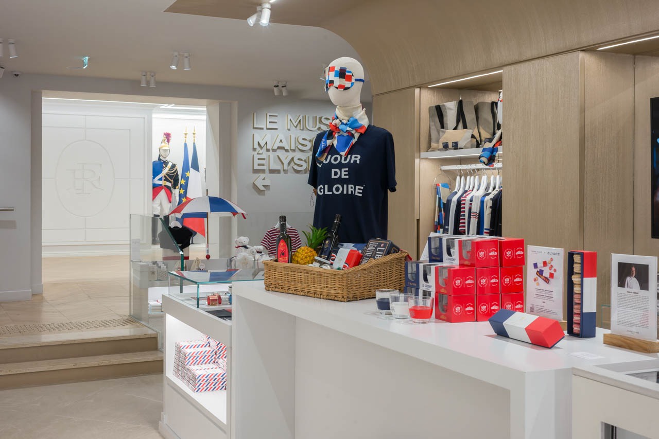 さすが大統領官邸の管轄。入り口の警備は民間ではなく共和国憲兵隊が担っている。その厳かな入り口を過ぎると、洗練された空間に包まれたギフトショップが現れる。共和国カラーに彩られた製品の数々は、すべてが“フランスを代表する”という誇りを備えており、まさにエリゼの美学を手に取るように感じられる。ブティックを抜けた先には、展示室への扉が静かに待っている。