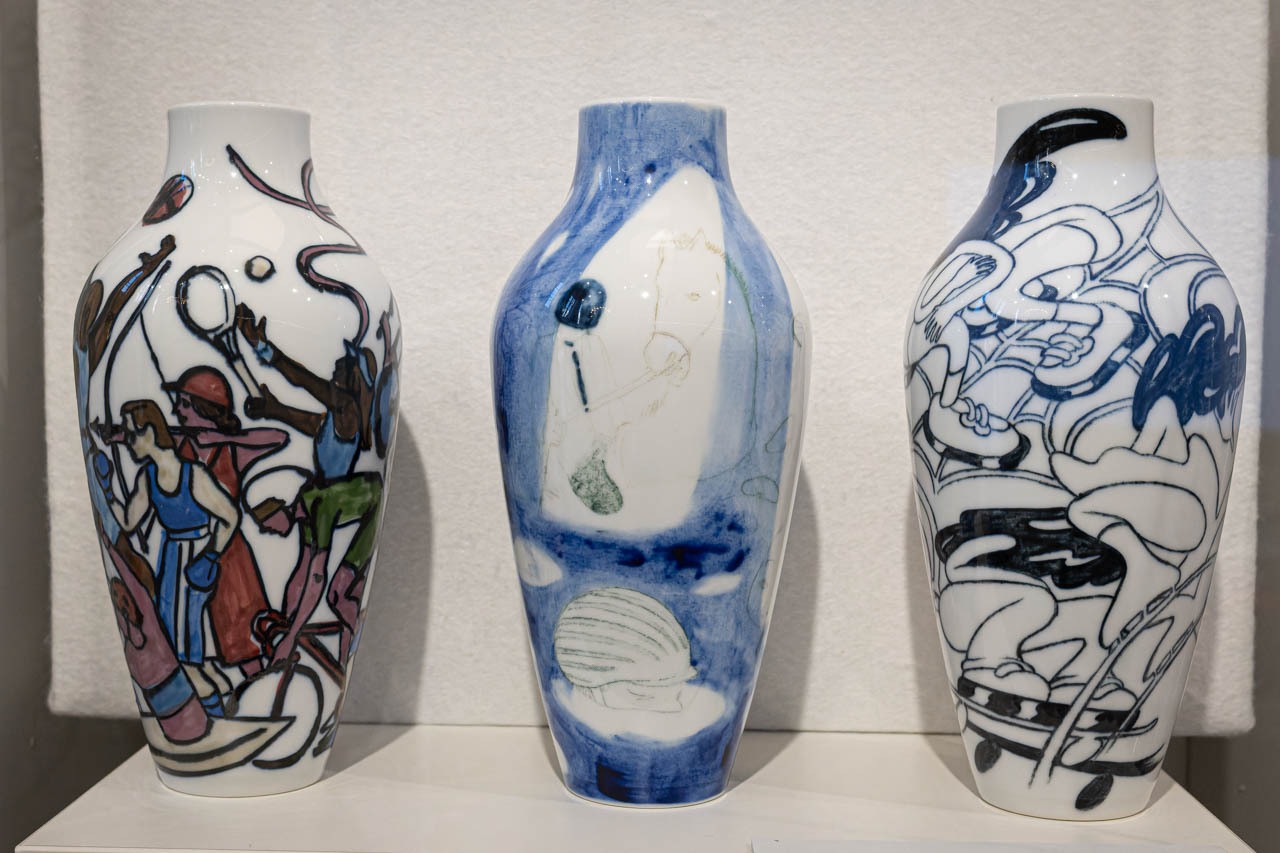 ここではオリンピックに関するモノの展示も見られる。パリ国立セーヴル磁器製作所が製作したトロフィー花瓶は、パリ国立美術学校の若き才能たち6名によってそれぞれ異なる解釈でデザインされた。セーヴル独自の青色顔料へのオマージュをはじめ、呼吸器系、スポーツの象徴性、漫画的表現、動物の寓意など、詩的な解釈によって多様なスポーツの精神を表現している。