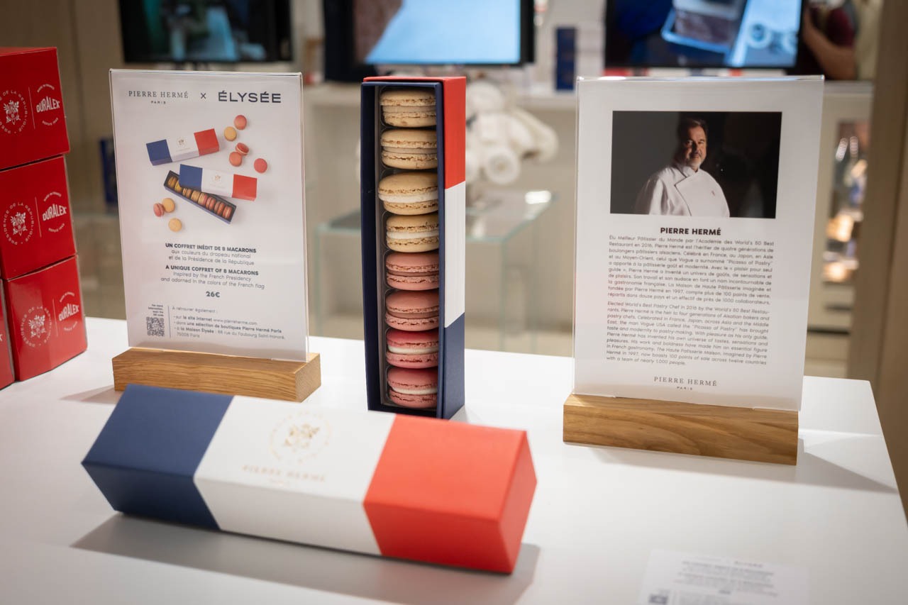 ピエール・エルメによるマカロンの新作ボックスは、フランス国旗を模した特別パッケージに8個のマカロンが収められたエリゼ宮限定品。味覚の魔術師として知られるエルメ氏によるこのコレクションは、フランスの芸術性と洗練を体現している。