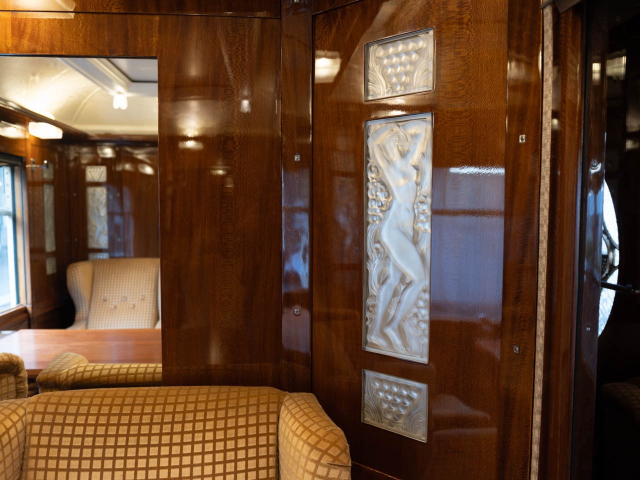 《Flèche d’Or 4159》の壁面を彩るのはルネ・ラリックによるガラス装飾。1920年代のアール・デコ期に生み出されたモチーフは、鉄道車両に芸術を持ち込むというオリエント急行の理念を象徴している。