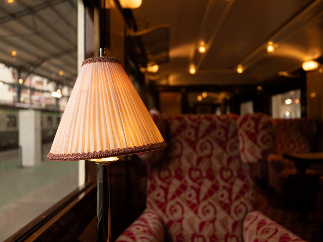 窓辺に灯るランプの下、名探偵ポワロと乗客たちのやり取りが繰り広げられる―そんな映画の一場面を思わせるバー車のひとコマ。