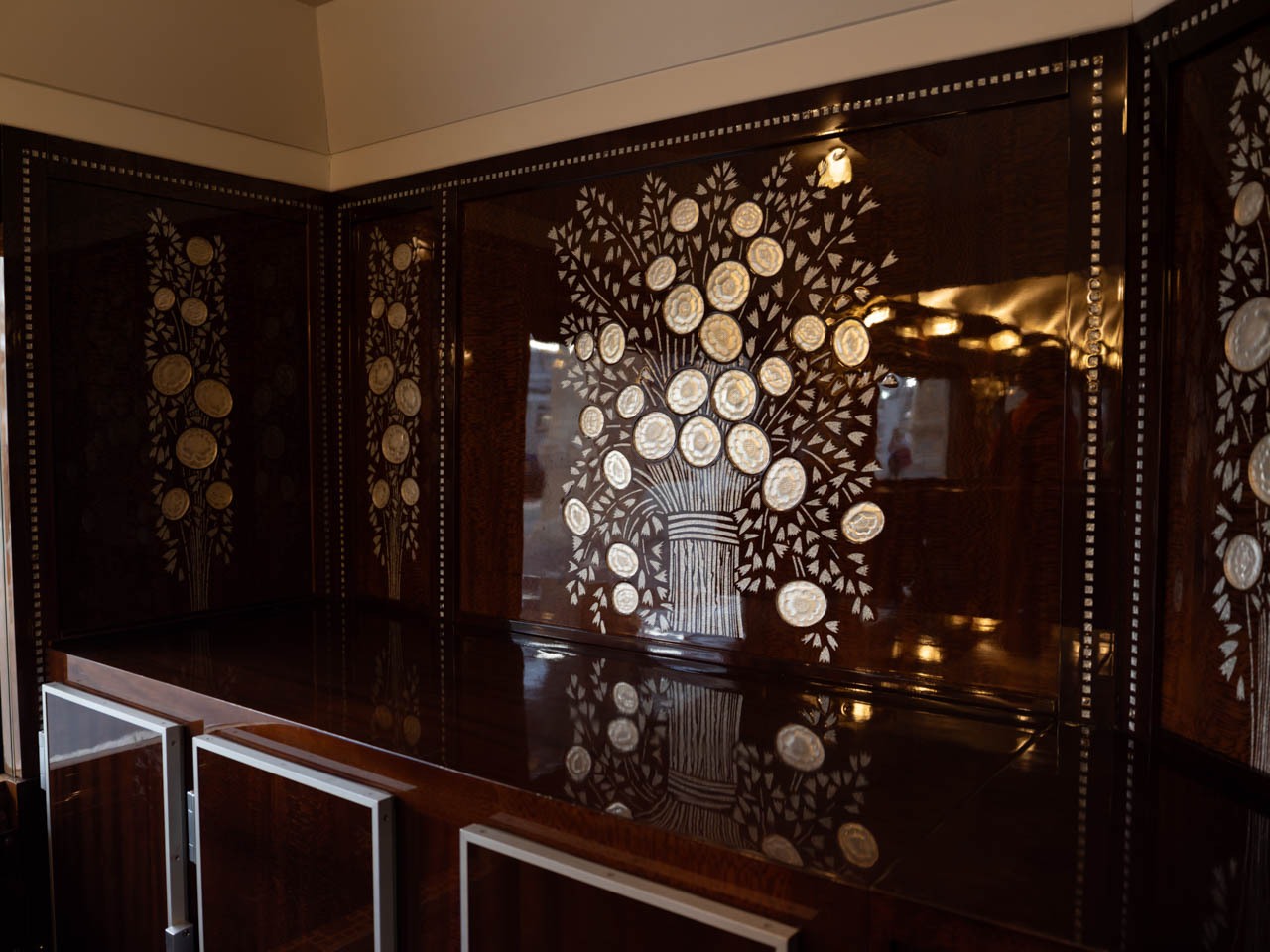 《Train Bleu 4160》のインテリアを特徴づけるのが、花束を描いた象嵌パネル。艶のある木目に真珠母貝や金属を埋め込み、光の加減で表情を変える。南仏へ向かう富裕層の旅にふさわしい、華麗なアール・デコの一例である。
