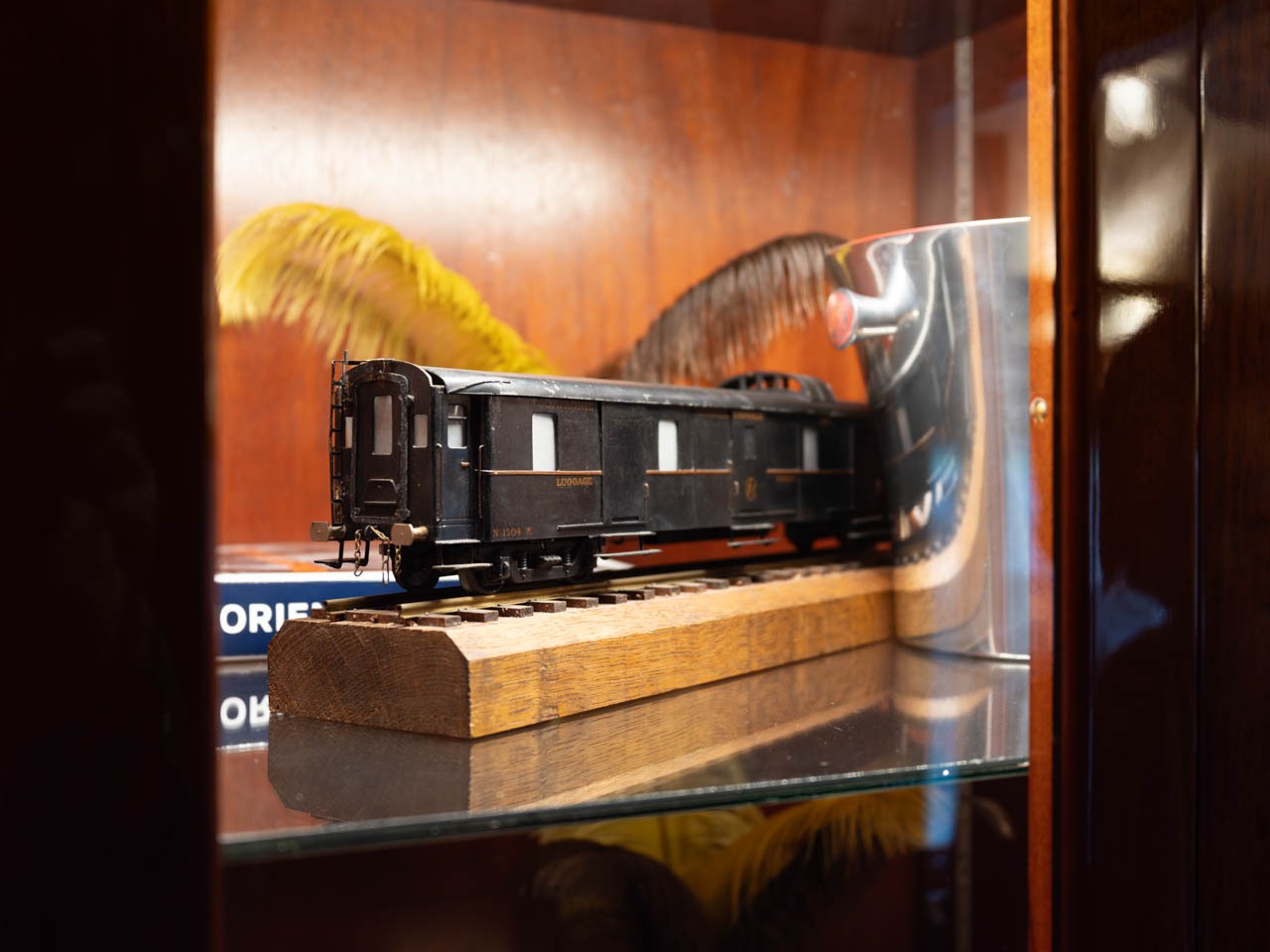 バー車《Train Bleu》のデッキには、オリエント急行にまつわるグッズがショーケースに収められていた。往年の荷物車を模した模型は、豪華列車の物語を手のひらの中に閉じ込めている。