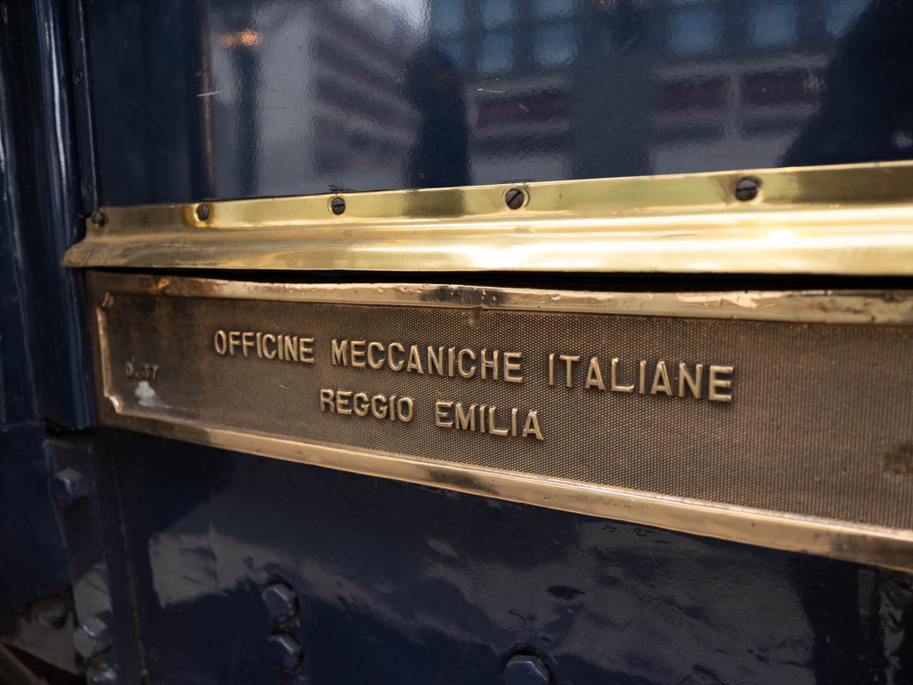 『Officine Meccaniche Italiane – Reggio Emilia』の銘板。イタリアで製造された車両であることを示すプレートは、オリエント急行がヨーロッパ各国の技術の結晶であったことを伝えている。