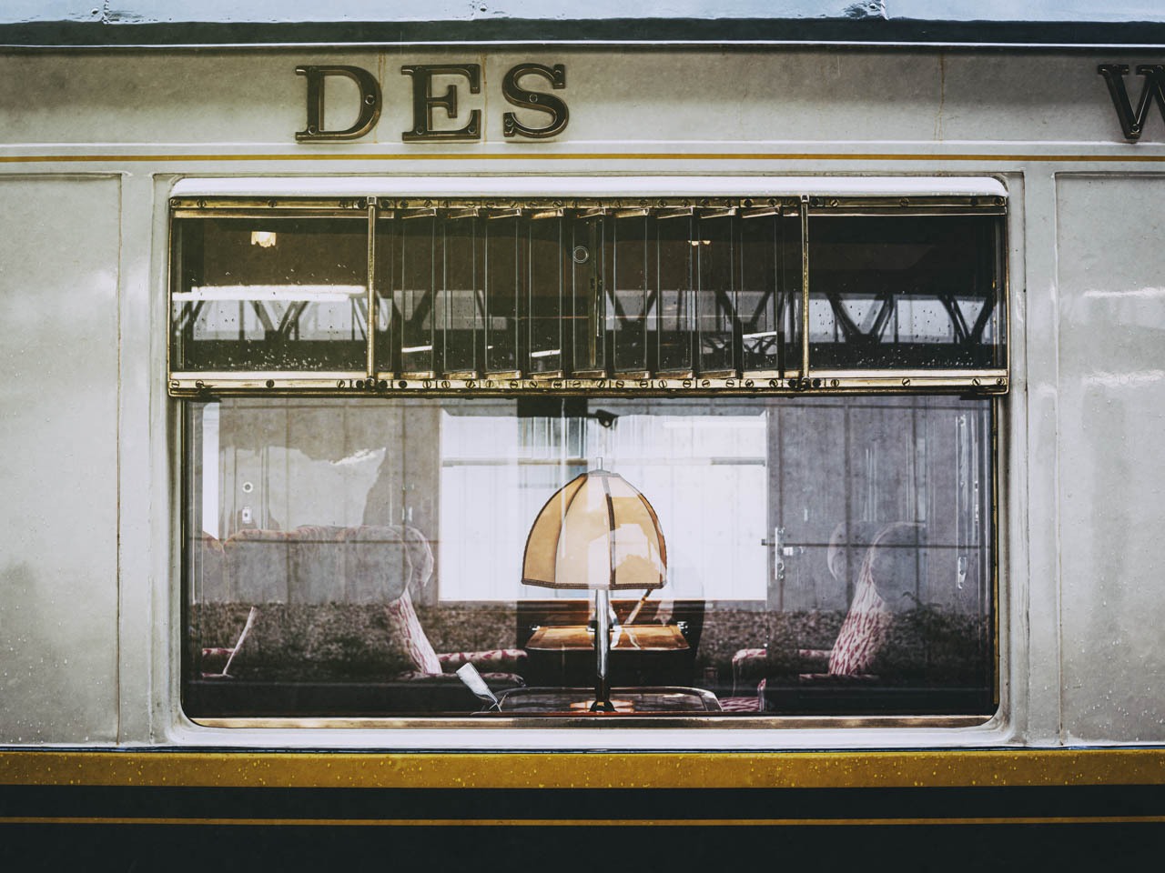 窓の向こうに広がるのは、まるで映画『オリエント急行殺人事件』の舞台のような世界。ランプの柔らかな光が、豪華列車の物語を静かに紡いでいる。