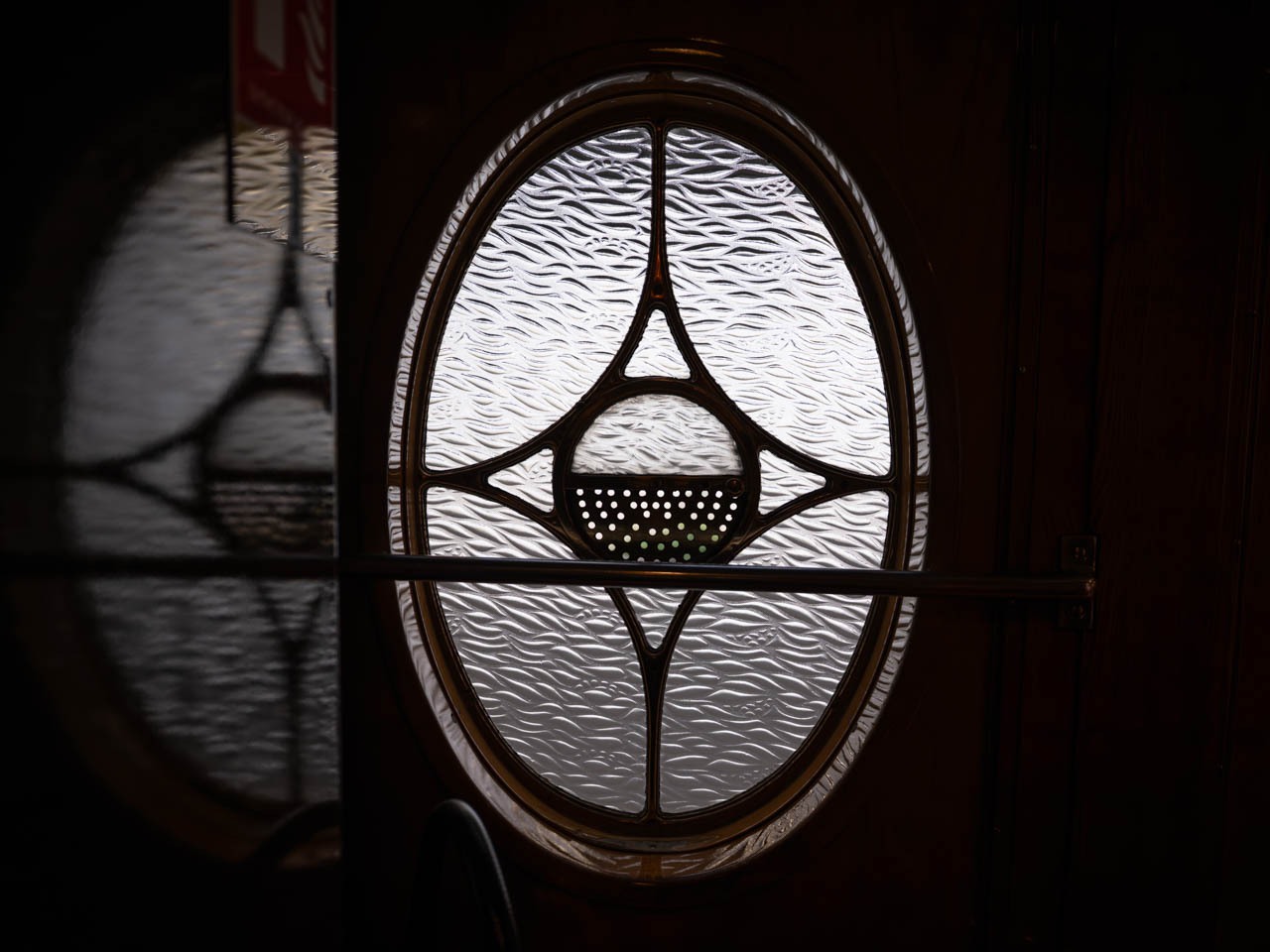 楕円形の装飾窓は、オリエント急行を象徴する意匠のひとつ。波打つガラスに幾何学的なモチーフを組み合わせ、アール・デコの美学を凝縮している。