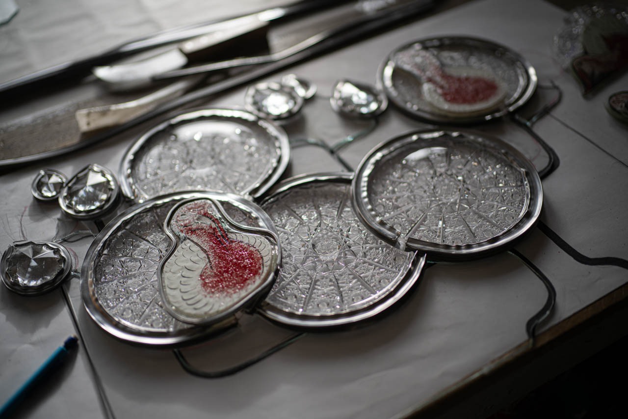一般にステンドグラスは色ガラスや彩色したガラス片で構成されるが、ミレーヌ・ビヤンの制作では、ファセット状にカットされた透明ガラスや、細かなヒビ模様をもつテクスチャーガラスをあえて組み込む。光を受けた面はプリズムのように反射し、鉛線(カーム)の輪郭に沿ってきらめきが走る。色で絵を描くのではなく、透明度・凹凸・カット面の方向で光そのものを設計する——その発想が、同じ“窓の絵”でもまったく異なる奥行きを生んでいる。
