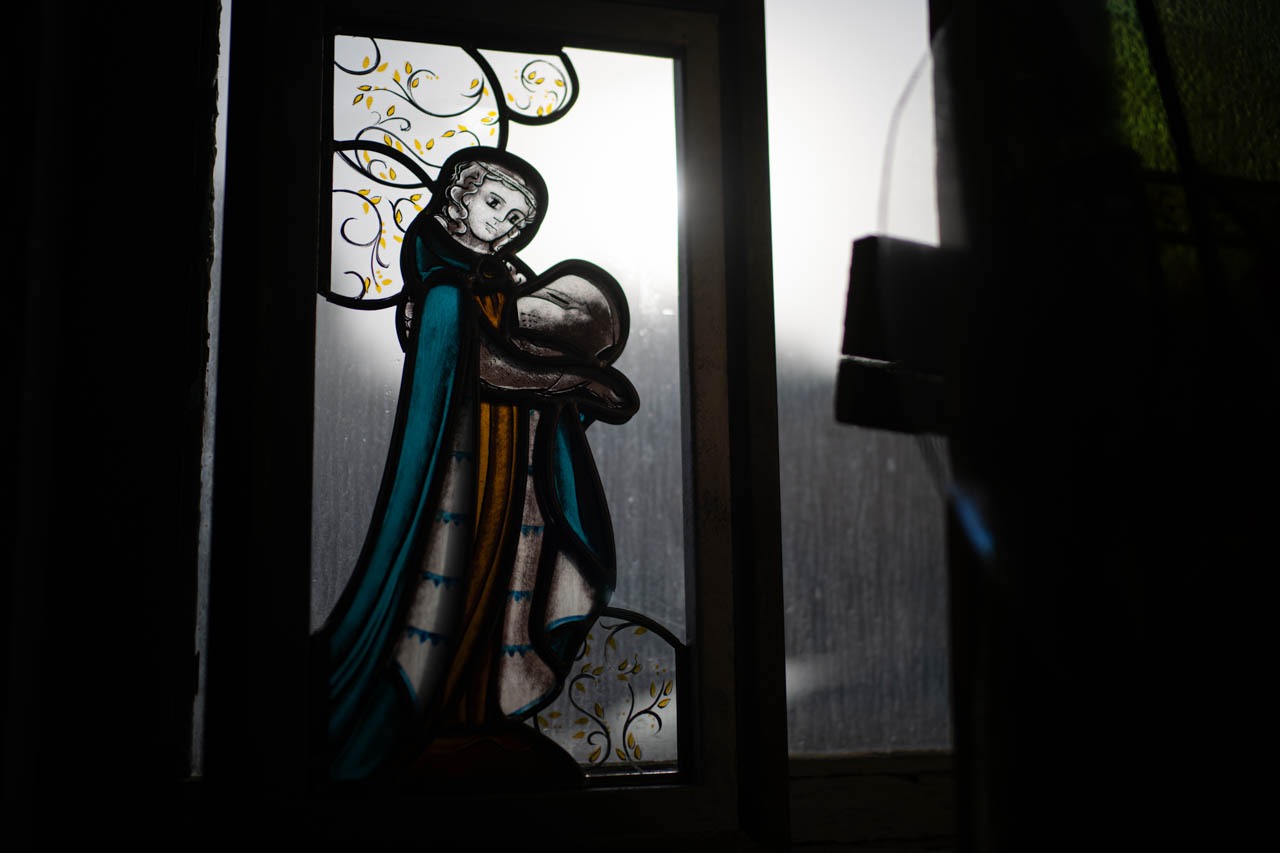 ルーヴル・カルーゼルの職人イベントで展示されていたステンドグラス作品を、ミレーヌ・ビヤンは自身のアトリエの窓辺に置いていた。逆光の中で「顔をよく見て」と促されて気づくのは、意図的に誇張された大きな眼差しで、日本の漫画表現、とりわけ鉄腕アトムに通じる造形感覚が静かに織り込まれている。中世的な宗教図像の構図を借りながら、現代日本の視覚文化を重ね合わせるその手法は、彼女の作品が単なる修復や再現ではなく、文化を横断する現在形のステンドグラスであることを雄弁に物語っている。