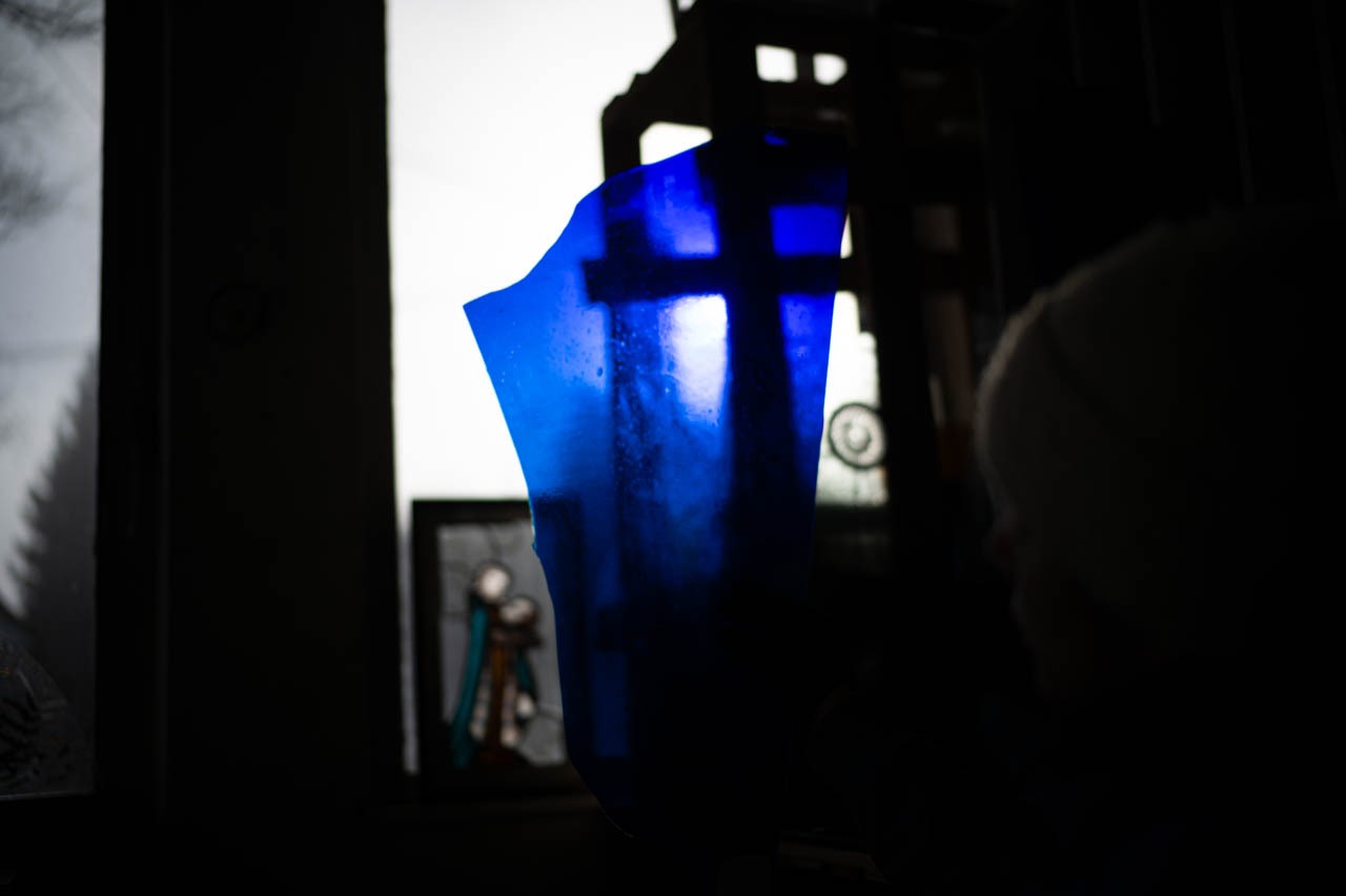 次にミレーヌが見せてくれたのは、工業製のフラットガラスとは対照的な、手吹きで生まれた青いガラス片だ。すでに一度使われ、再利用のためにラフにカットされているが、縁のゆがみや厚みのムラ、光に透かしたときに現れる微細な気泡や流れ筋が、この素材が「手の熱」で引き延ばされてきた履歴をそのまま残している。色味も一様ではなく、場所によって濃淡が揺れ、同じ青でも透過の密度が変わる。ミレーヌはこの不均質さを欠陥ではなく、作品の陰影と奥行きを設計するための“使える個性”としてストックしている。