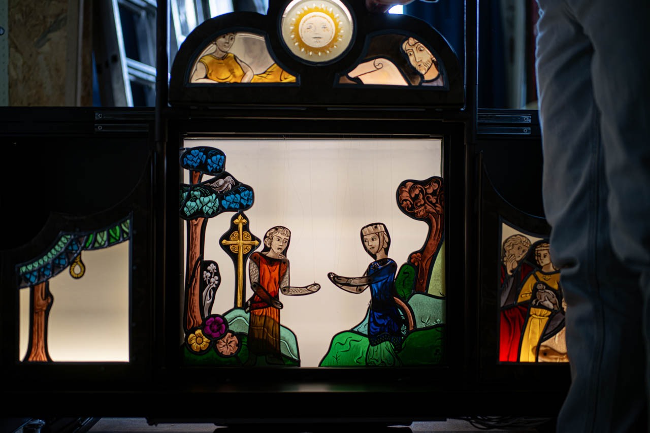 その思考が最も鮮明になるのが、ステンドグラスのマリオネット作品だ。